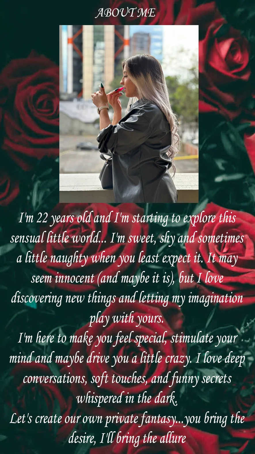 Tarian Erotik, Main jari, Mandi, Alat Permainan Seks, Main Peranan, Lateks, Kulum, Melancap, Seks Tetek, Sumbat Mulut, Gaya Anjing, Fetisy Kaki, Penghinaan, Nilon, Urut, Melancap dengan kaki, Lancap Menggunakan Tangan, Pertunjukan Minyak, Gaya Berkuda, Alat Permainan Puting, Tegar, Luar, Separuh Bogel, Tumit tinggi, Pancut, Orgasma, Hisap Sedalam Mungkin, Tarian Bogel, Dildo atau Penggetar, Tampar Punggung, Ahegao